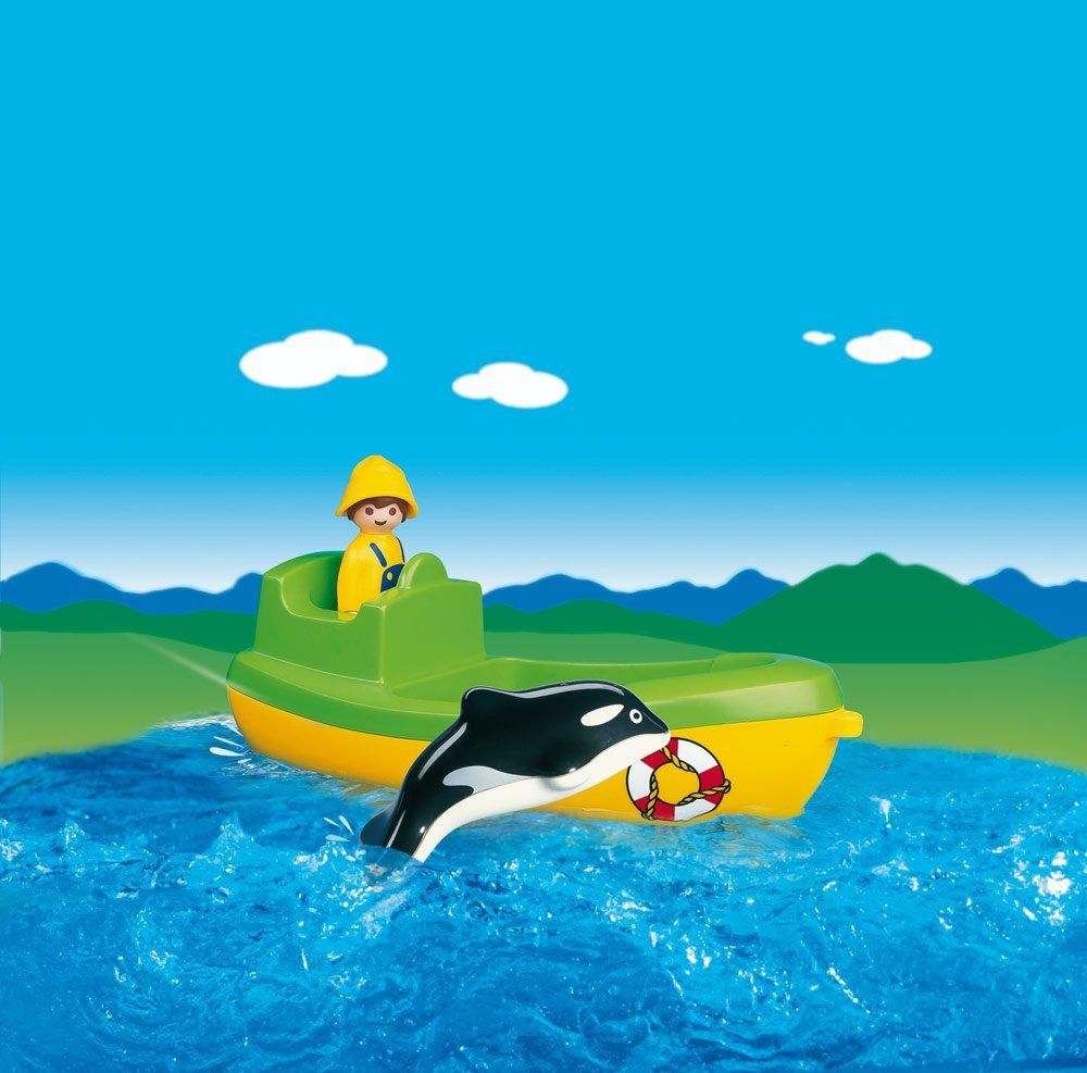 Le dauphin nage dans deux positions. Coffret comprenant: le pêcheur et son bateau. le dauphin et la bouée.