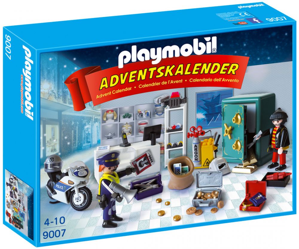 Contient deux personnages, un coffre fort, une moto, et des accessoires (meubles, valises, casques, armes …). Le cambrioleur vient de dévaliser la bijouterie. Il a bien l'intention de s'attaquer au coffre-fort… Le motard de police arrivera-t-il à temps pour l'en empêcher ? Les calendriers de l’Avent PLAYMOBIL avec 24 fenêtres prémontées pour créer une mise en scène complète jusqu’à Noël.