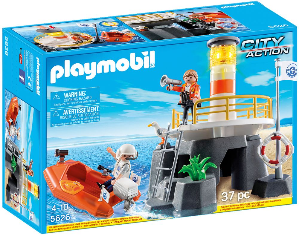 Contient deux personnages de sauveteurs, un phare sur un rocher, un bateau de sauvetage et de nombreux accessoires. Le phare s'illumine et clignote. Le bateau flotte. Dimensions (LxPxH) cm : 20 x 17 x 22.