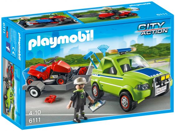 Le jardinier va entretenir les espaces verts de la ville. Hop ! Il monte sur son tracteur tondeuse et c'est parti ! Comprend un personnage, un véhicule avec remorque, un tracteur tondeuse et de nombreux accessoires (outils, tablette avec plan…). Le tracteur tondeuse peut être transporté grâce à la remorque. La remorque peut être détachée du véhicule.