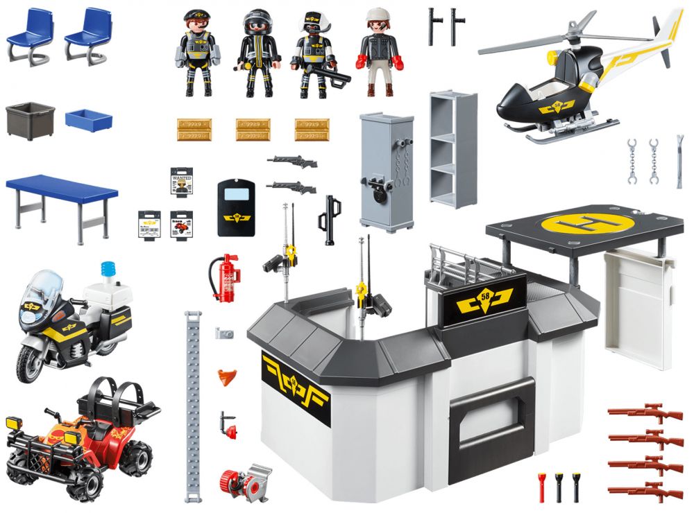 Avec un hélicoptère, une moto avec gyrophare (piles incluses), un centre de contrôle et un quad. Se replie pour être emporté partout. Dès qu'il y a une urgence, les policiers d'élites prennent l'hélicoptère. Avec un hélicoptère, une moto avec gyrophare (piles incluses), un centre de contrôle et un quad. Se referme pour être emporté partout. Dimensions : 33 x 13 x 20,5 cm (LxPxH).