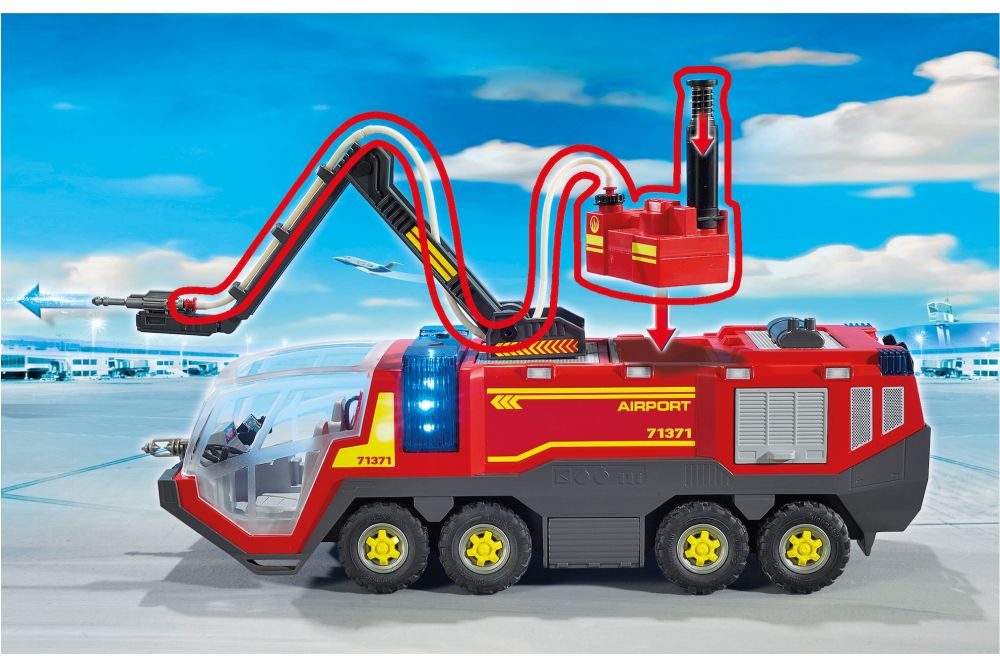 Contient trois plots, une caisse, divers outils et accessoires (pied de biche, mégaphone, lampe torches, casques…). Le véhicule possède différents coffres qui s'ouvrent. La lance à eau tourne sur elle-même et se plie en plusieurs points. Le véhicule émet de la lumière et du bruit. Intervention immédiate sur les pistes ! Les pompiers sont en charge de la sécurité incendie sur l'aéroport. Grâce à leur véhicule spécialement conçu pour les aéroports avec un bras articulé projetant de l'eau, des effets sonores et lumineux, aucun feu ne leur résistera.