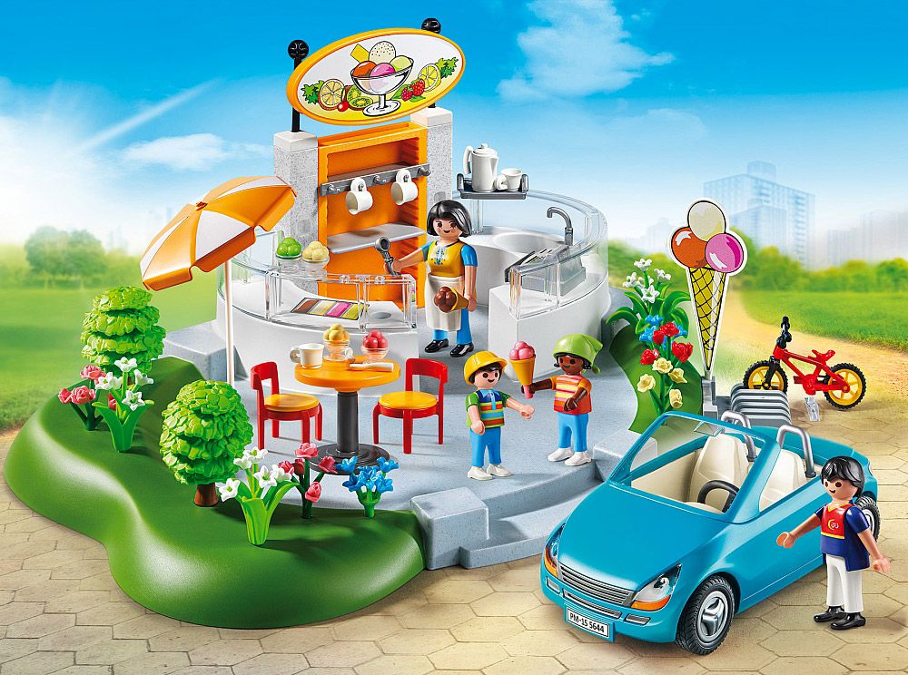 Contient quatre personnages (deux adultes et deux enfants), un salon de thé et glacier, une voiture cabriolet, un vélo et de nombreux accessoires.