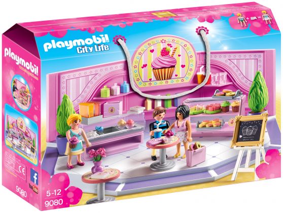 Café Cupcake avec des tartes, gâteaux et glaces alléchantes pour attirer les clients. Avec de nombreux accessoires. Outre une marche, une rampe accessible aux poussettes et fauteuils roulants permet d'accéder au café.