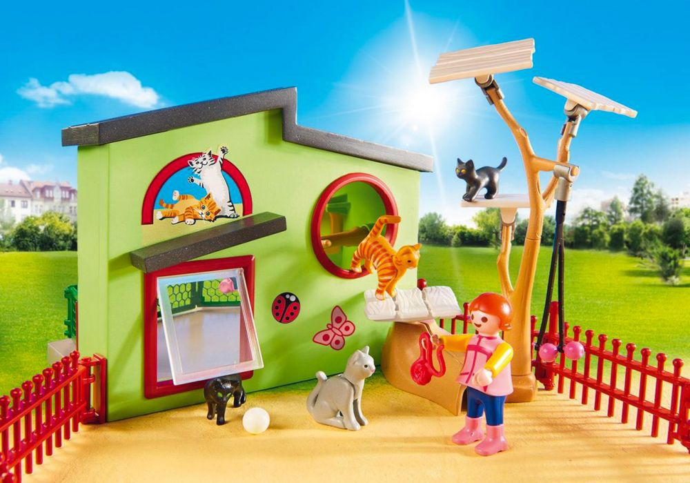 Avec de nombreux jouets, arbre d’escalade et cachettes pour les chats. L’intérieur et l'extérieur de l'enclos communiquent par une porte battante. À l’intérieur, une branche suspendue relie les cachettes et les éléments d’escalade. Certains chats peuvent se réfugier dans les cachettes. La litière pour chat peut être nettoyée au moyen du kit de nettoyage (pelle et seau). À l’extérieur, un grand arbre d’escalade et des surfaces de repos invitent à l’amusement et à la détente. La planche d’étiquettes fournie comprend dix motifs de pattes d’animaux pouvant être utilisés pour décorer à souhait les murs du bâtiment. Le panier à chat transportable peut contenir l’un des bébés chats ou le chat gris assis. Les chats sont ravis de passer quelques jours de vacances au sein de la pension pour chats. Il y a plein de choses à découvrir et à vivre. La chatière permet aux compagnons à quatre pattes d’entrer et de sortir à leur guise. Il y a même une grille d’escalade qui permet aux petits chatons de l’atteindre. Pendant que les chats jouent, la soigneuse s’occupe de mettre suffisamment de nourriture à disposition et de nettoyer la litière à l’aide d’une pelle et d’un seau. Bienvenue au paradis des chats.Personnalisation créative: grâce aux autocollants d’animaux fournis, la pension pour animaux peut être décorée de façon personnalisée. Dimensions: 32 x 17 x 13 cm (LxPxH), clôture flexible.