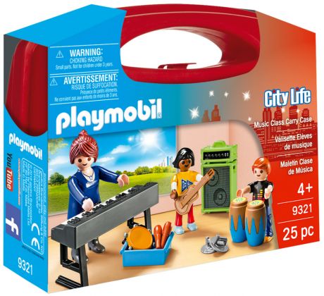 Avec de nombreux instruments. Tous les accessoires peuvent être rangés dans la valisette. Avec de nombreux instruments de musique. Seul un personnage adulte peut jouer du clavier. Les petits instruments peuvent être rangés dans la valisette.