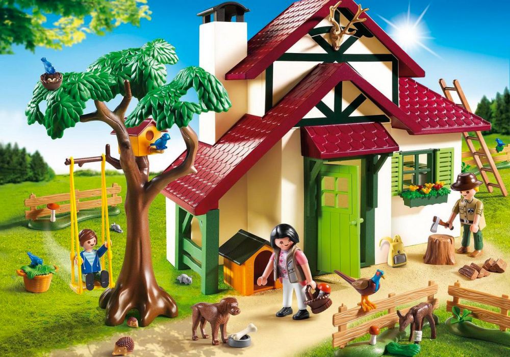 Contient deux personnages adultes et un enfant, un arbre avec une balançoire, un nid, quatre barrières, des animaux (oiseaux, chiens, faon...) et de nombreux accessoires (niche, fusil, chaises, bureau, échelle). Quelle belle journée, le faon blessé dans son enclos va mieux ! Le garde forestier coupe du bois à la hache pour le four à bois, pendant que sa femme cueille des champignons plantés dans l'arbre. Leur fils profite de sa balançoire suspendue à l'arbre et s'amuse avec le chien.