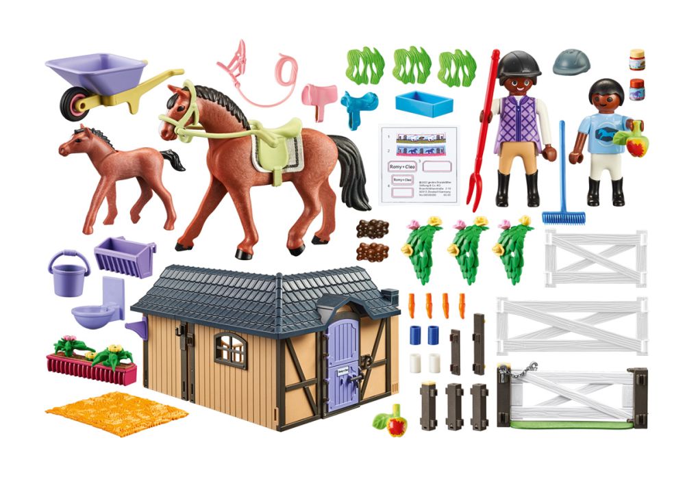 La jument Playmobil et son poulain coulent des jours heureux dans leur étable, soignés par les cavaliers. Fournis avec tous les accessoires nécessaires à l'entretien de leur crinière ainsi que de leurs sabots, ce set de jeux comprend également une carrière, idéale pour que les chevaux entretiennent leur santé.