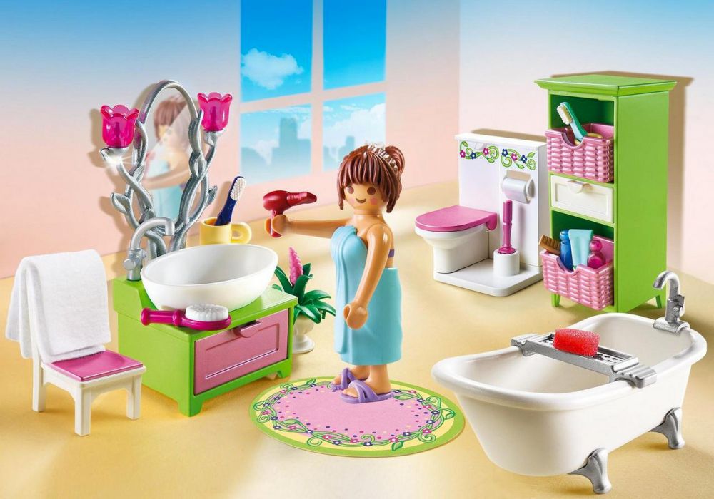 Contient un personnage, une baignoire, une toilette, des meubles (étagère, coiffeuse…) et de nombreux accessoires (sèche-cheveux, brosse, éponge, serviette…). Top ! J'ai enfin réussi mon brushing ! Comprend une femme avec serviette de bain, une baignoire, toilettes, des meubles (étagère, coiffeuse…) avec de nombreux rangements et des accessoires (sèche-cheveux, brosse, éponge, serviette…).