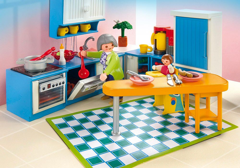Mamie se dépêche de préparer le biberon de Léa : la petite s'agite dans sa chaise haute car c'est l'heure de son goûter ! Cuisine meublée d'une table avec deux chaises, chaise bébé et équipement de cuisine (évier, four, plaques de cuisson, lave-vaisselle). Avec deux personnages, un chien et nombreux accessoires (couverts, assiettes, aliments différents…).