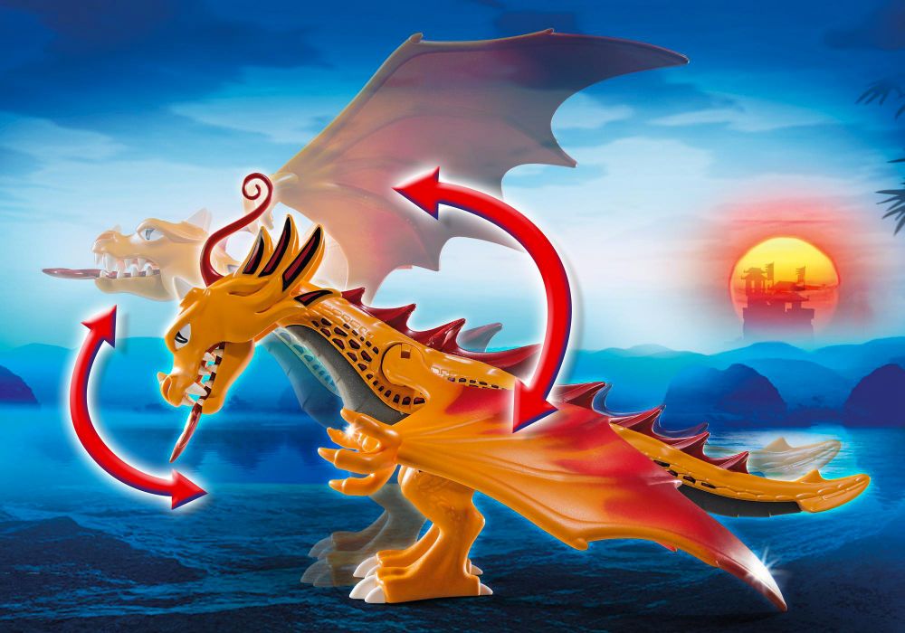 Contient un personnage armé d'arc, flèches et bouclier. Les membres du dragon sont mobiles. Le dragon peut tenir des accessoires.