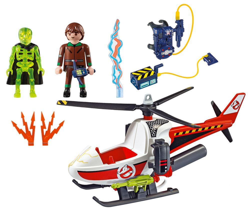Comprend le héros Ghostbusters Peter Venkman, un fantôme et un hélicoptère qui projette de l'eau. L'agent Ghostbuster Venkman est habillé comme dans la série animée «The Real Ghostbusters». L’hélicoptère peut accueillir un chasseur de fantômes et des accessoires tels que le Proton Pack, le pistolet à protons, le compteur d’énergie PsychoKinétique et le piège à fantômes.-L'hélicoptère projette de l'eau, le réservoir à eau est amovible et l’eau est éjectée au moyen d’une pression sur le réservoir.