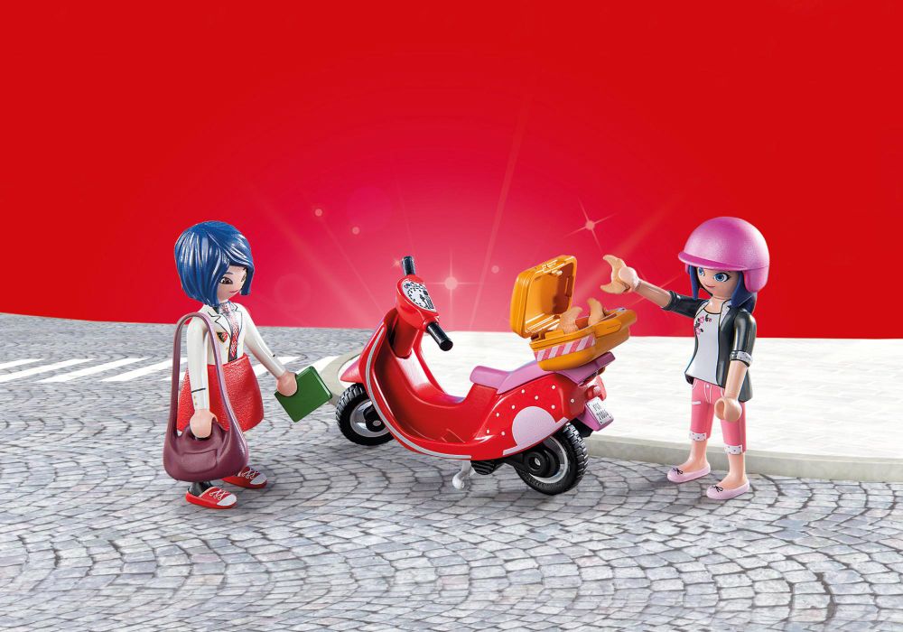 Rejoignez Marinette sur son scooter, elle se faufile dans les rues de Paris pour livrer les délicieuses pâtisseries de ses parents. Kagami attend son délicieux croissant. Comprend Marinette, Kagami, un scooter, une colonne Morris et des accessoires.