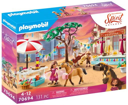 Plongez dans le monde actif de Lucky et vivez des aventures passionnantes. Lucky visite le festival de Miradero avec son Mustang Spirit sauvage. Il y a tant de choses à découvrir ici : des étals débordants d'artisanat, de jouets et de fleurs, des lumières de Noël colorées et une musique joyeuse. Spirit, bien sûr, est particulièrement intéressé par les fruits frais dans le panier. Lucky profite de l'atmosphère exubérante du festival. Après un moment, elle danse sur la piste de danse. De nouveaux jeux Spirit amusants pour les fans de tous âges. Le set comprend Lucky et Mustang Spirit, le Père Jim et Snips, deux stands avec des bonbons, des fruits et des fleurs, ainsi que des plateformes rotatives sur lesquelles les personnages peuvent danser.