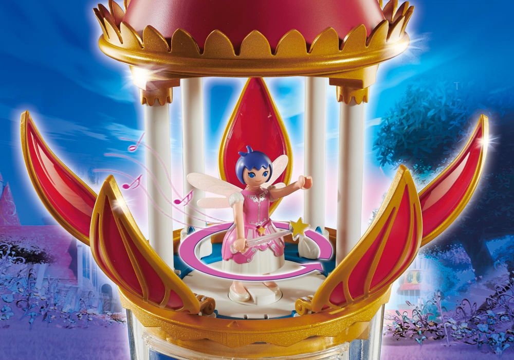 Contient 2 personnages, 1 tourelle musicale, 1 bébé licorne et de nombreux accessoires (baguettes, verres, bandage…). Les pétales se déplient. Avec effets sonores inspirés du thème musical de série TV.