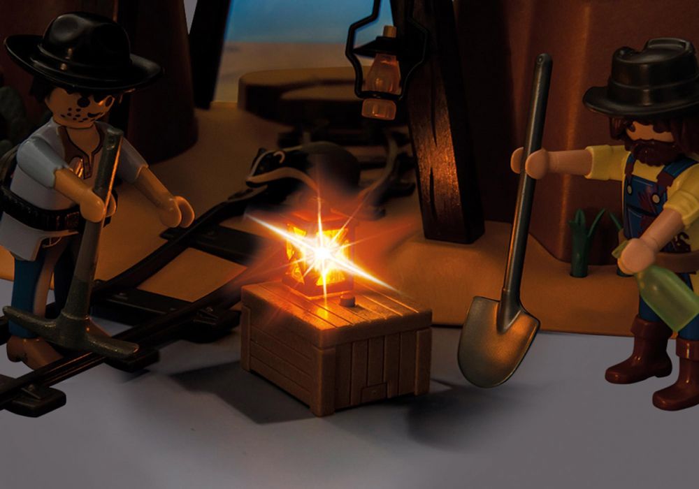 C'est la ruée vers l'or dans le Far-West Playmobil ! Cette grotte discrète renferme un précieux butin : l'or. Avec la pioche, les chercheurs d'or tentent de ramasser les précieuses pépites pour ensuite les transporter à l'extérieur à l'aide du wagonnet. Mais il faut faire attention car à la moindre secousse, tout peut s'effondrer. Les hommes ont à peine mis un pied dehors que la mine s'effondre derrière eux. Pour récupérer les pièces d'or restantes, ils utilisent des bâtons de dynamite. Le coffret de jeu contient trois personnages, plusieurs animaux, une mine d'or, des pépites d'or et de nombreux accessoires. Un des rochers peut être ouvert en deux et former une cachette secrète pour les pépites d'or.