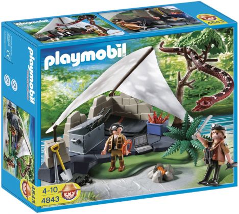 Contient deux personnages, un campement, deux animaux dont un serpent flexible et de nombreux accessoires. Les personnages peuvent se glisser dans les sacs de couchage. Réveil difficile pour l'aventurier... Un énorme serpent lui fait face ! Il se glisse lentement hors de son sac de couchage et réveille son amie. Heureusement le serpent prend la fuite dans la jungle. Il vaut mieux ranger le campement et partir avant une autre mauvaise surprise ! Contient deux personnages, un campement, deux animaux (serpent géant flexible et scorpion) et de nombreux accessoires (matériel d'exploration, sac de couchage...). Les personnages peuvent se glisser dans les sacs de couchage.
