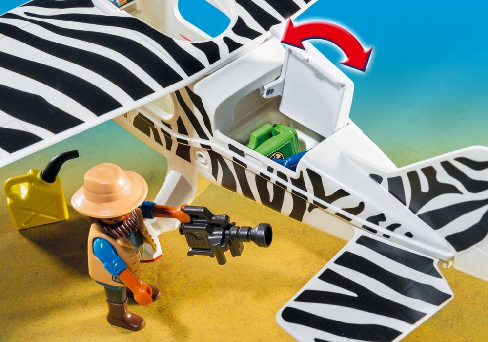 Contient deux places et un espace pour les bagages. Avec cales pour les roues de l’avion. L’hélice tourne. Avion prêt à décoller pour une nouvelle mission d'observation des animaux de la savane. Un avion avec deux personnages et de nombreux accessoires (valises, caméra, talkie-walkie, carte…).